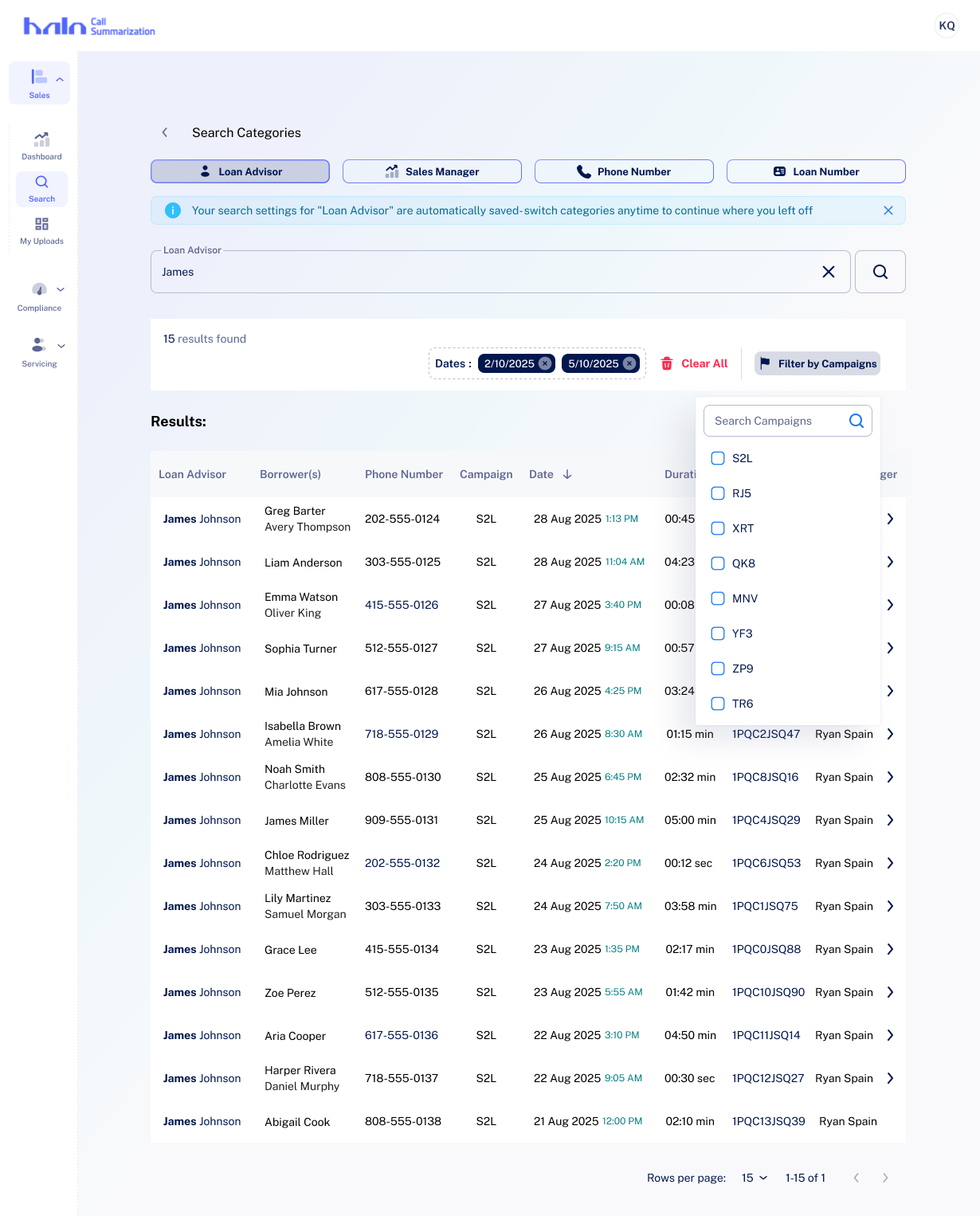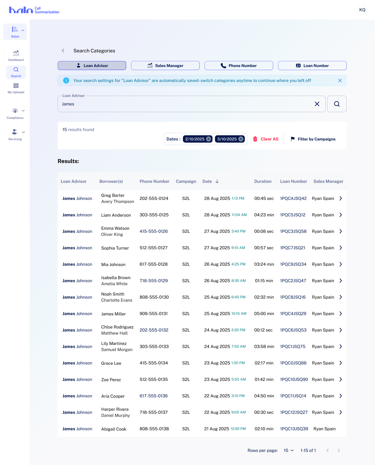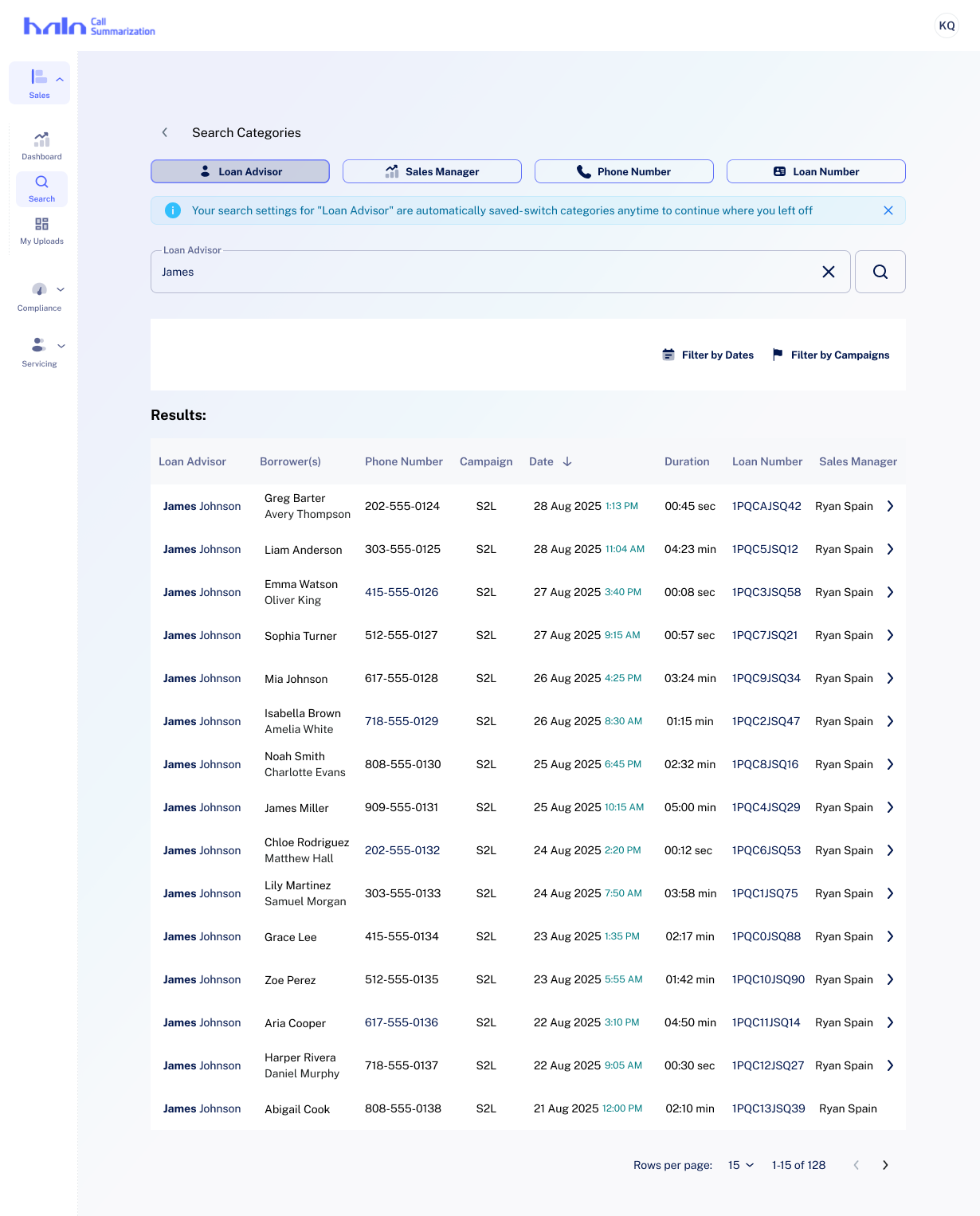 No search capability existed within Halo, Xpanse's AI call summarization platform. Loan Advisors and Sales Managers had no way to look up, sort, or filter call records by borrower, advisor, phone number, or loan ID — the only path to a specific call was manual scrolling.
